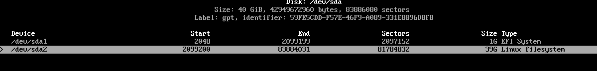 分区后会在硬盘号后面加上数字,例如/dev/sda1,记住刚刚的分区号或者用fdisk查看,1号是efi,2号是根目录